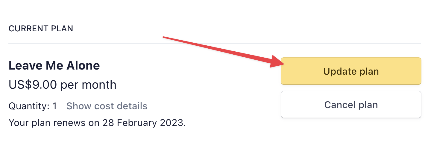 Then you can change your plan by clicking Update Plan and choosing the new one you want to subscribe to: