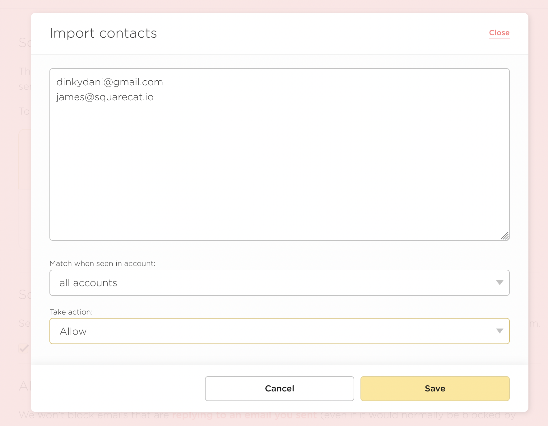 You will be shown the contact email addresses to import. Select the action that the Screener should take when it encounters these email addresses and select "Save".