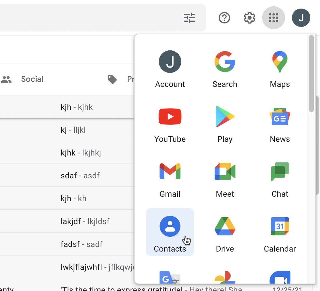 Visit Gmail and click the dots menu at the top right of the page. Click "Contacts".