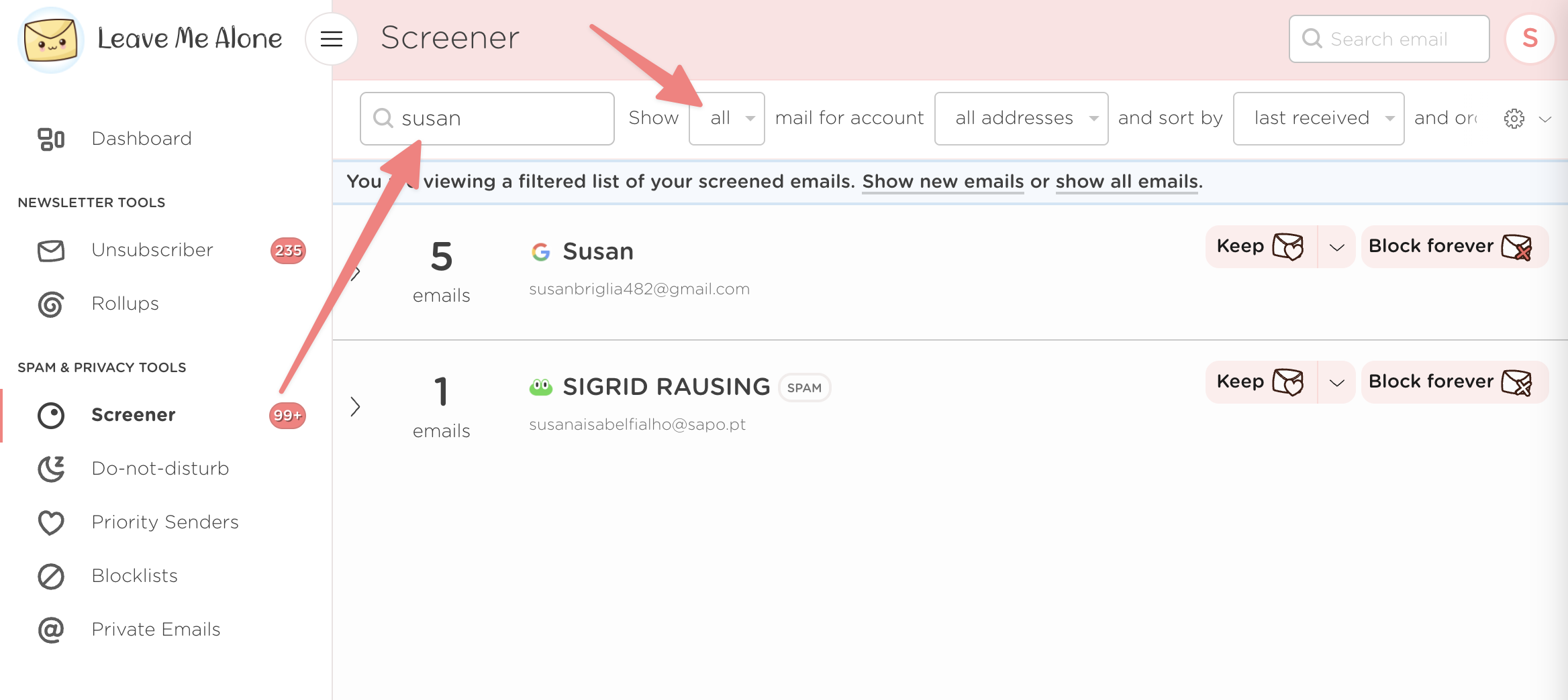 The easiest way to do this is the set the filter to show "all" emails, and to enter the name of the sender in the text filter like this: