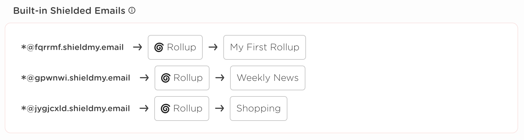 When we receive an email to one of your Shielded Email addresses we will perform the selected action (Rollup, Forward, etc) without exposing your actual email address.