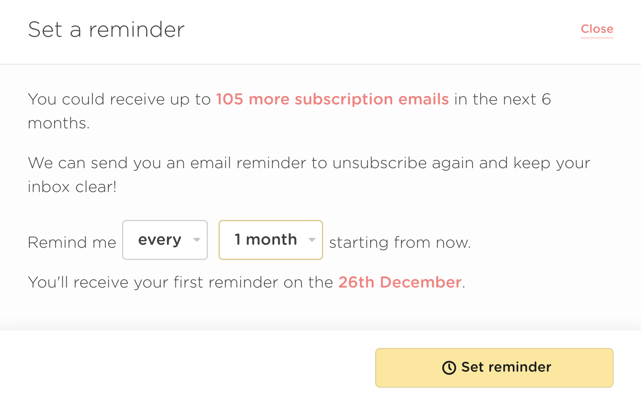 Unfortunately, pesky senders don't rest, so there's always work to be done. If you need us to remind you to check your subscriptions every so often, you can enable email reminders by following the steps below.